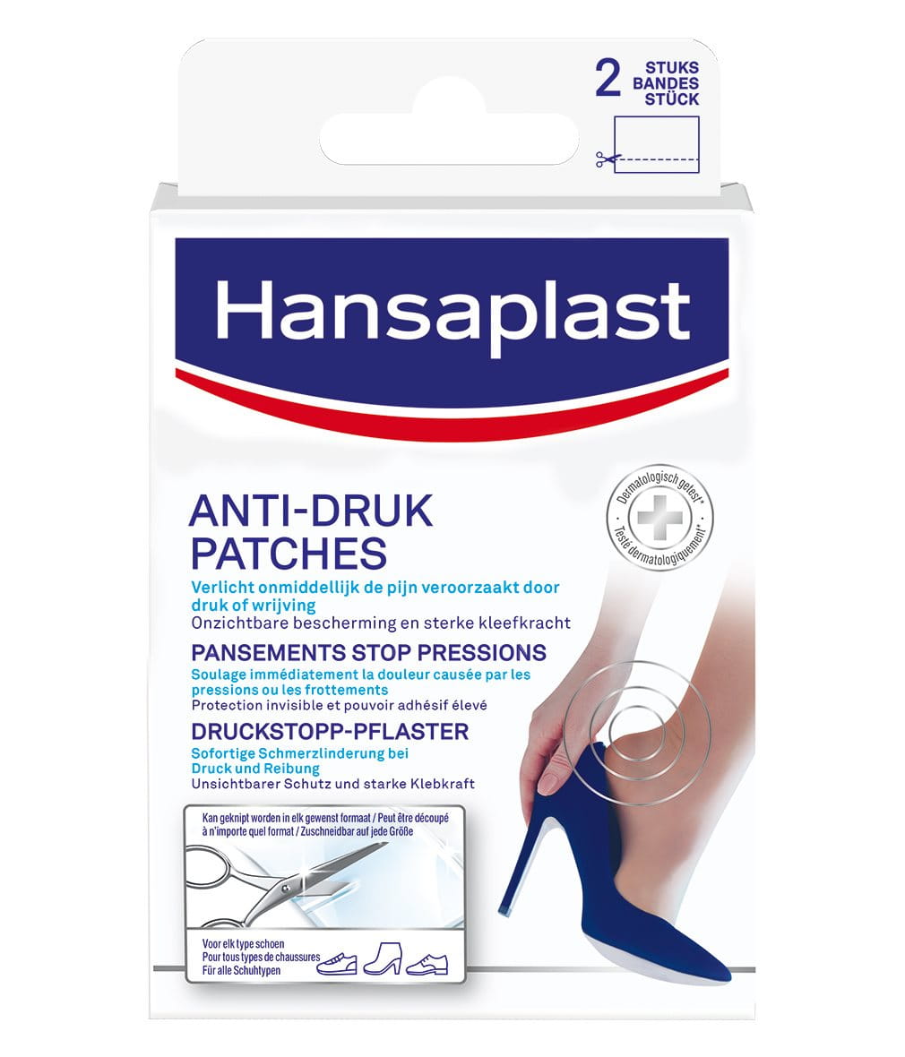 Hansaplast Anti-druk patches biedt onmiddellijke bescherming tegen pijnlijke druk en wrijving op elk deel van de voet. Het is vrijwel onzichtbaar en daarom uitstekend geschikt voor zomerschoenen met bandjes. Deze kan in elk gewenst formaat en elke gewenste vorm worden geknipt
